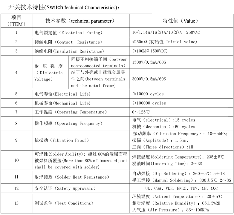 | 1 | Electrical Rating | 10(1.5)A/16(3)A/10(3)A 250VAC | |