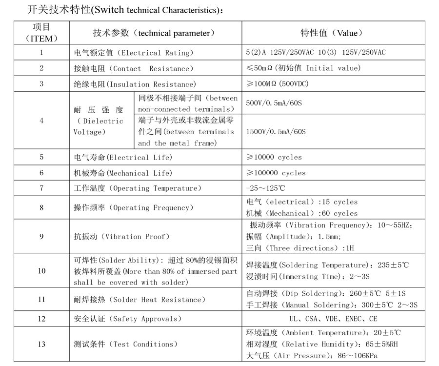 | 1 | Electrical Rating | 5(2)A 125V/250VAC 10(3)125V/250VAC | |