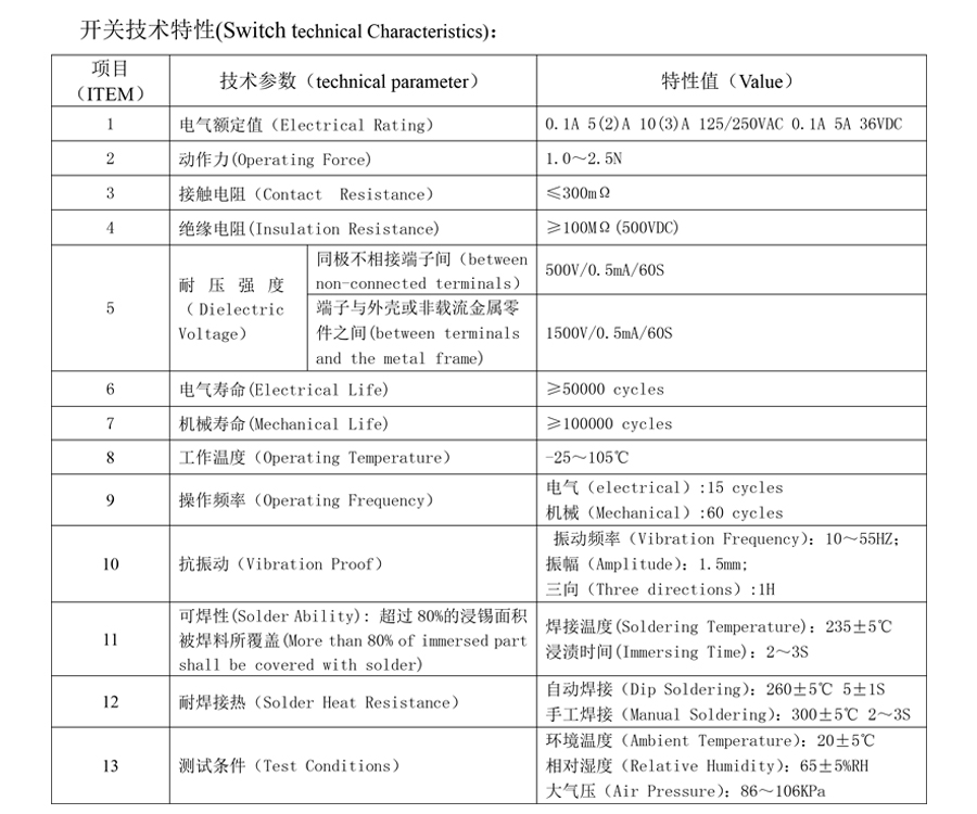 IMPERVIUS Micro SWITCH PBParameter(specificatio)