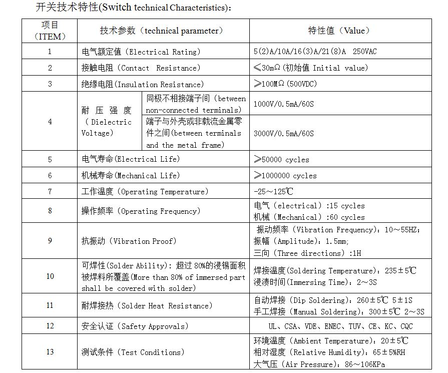 | 1 | Electrical Rating | 5(2)A/10A/16(3)A/21(8)A 250VAC | |